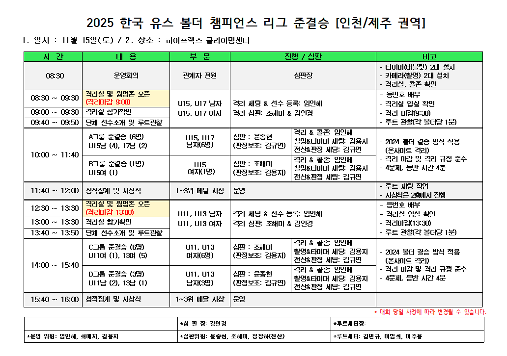 2025 유스 볼더 챔피언스 리그 준결승(인천/제주 권역) 일정 안내 작성자 정보 관리자 작성 29 조회 작성일 2025.11.13 09:48 컨텐츠 정보 본문 2025 유스 볼더 챔피언스 리그 준결승(인천/제주 권역) 일정 안내드립니다※자세한 내용은 하단 첨부 파일 확인바람. SNS 공유 관련자료 첨부 출전순서준결 인천제주명단.pdf 파일크기 (230.8K) 3 회 다운로드 등록일 2025.11.13 다음 2025 스포츠·아이스클라이밍 루트세터 신규 자격취득 검증 과정 개최 안내 작성일 2025.11.11 댓글 0개 등록된 댓글이 없습니다. 로그인한 회원만 댓글 등록이 가능합니다. 목록
